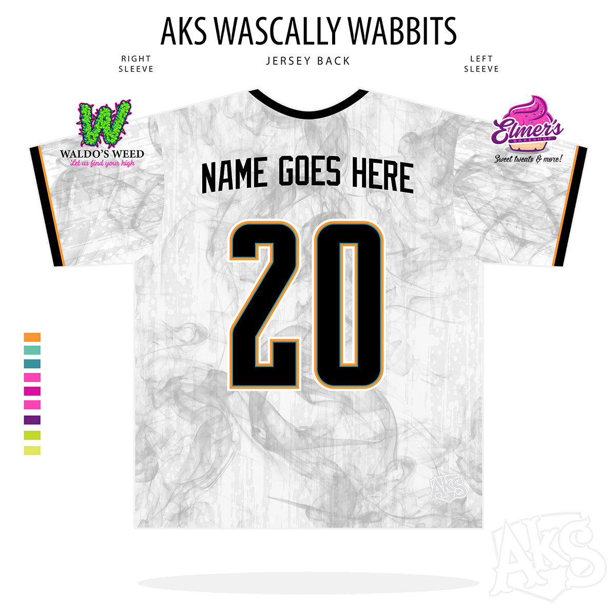 Our first 420 jersey featuring a Wascally Wabbit on a smoke jersey. The left sleeve features Waldo's Weed logo, the term 420 can be traced back to a group of students that called themselves The Waldos. The right sleeve features Elmer's Bakehouse logo, our homage to the term Wascally Wabbit.