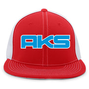 The new AkS Big Chi logo on a Red & White flatbill hat with Royal AkS and White outline, Royal AkSportswear on back. The logo may be slightly different in size and placement.