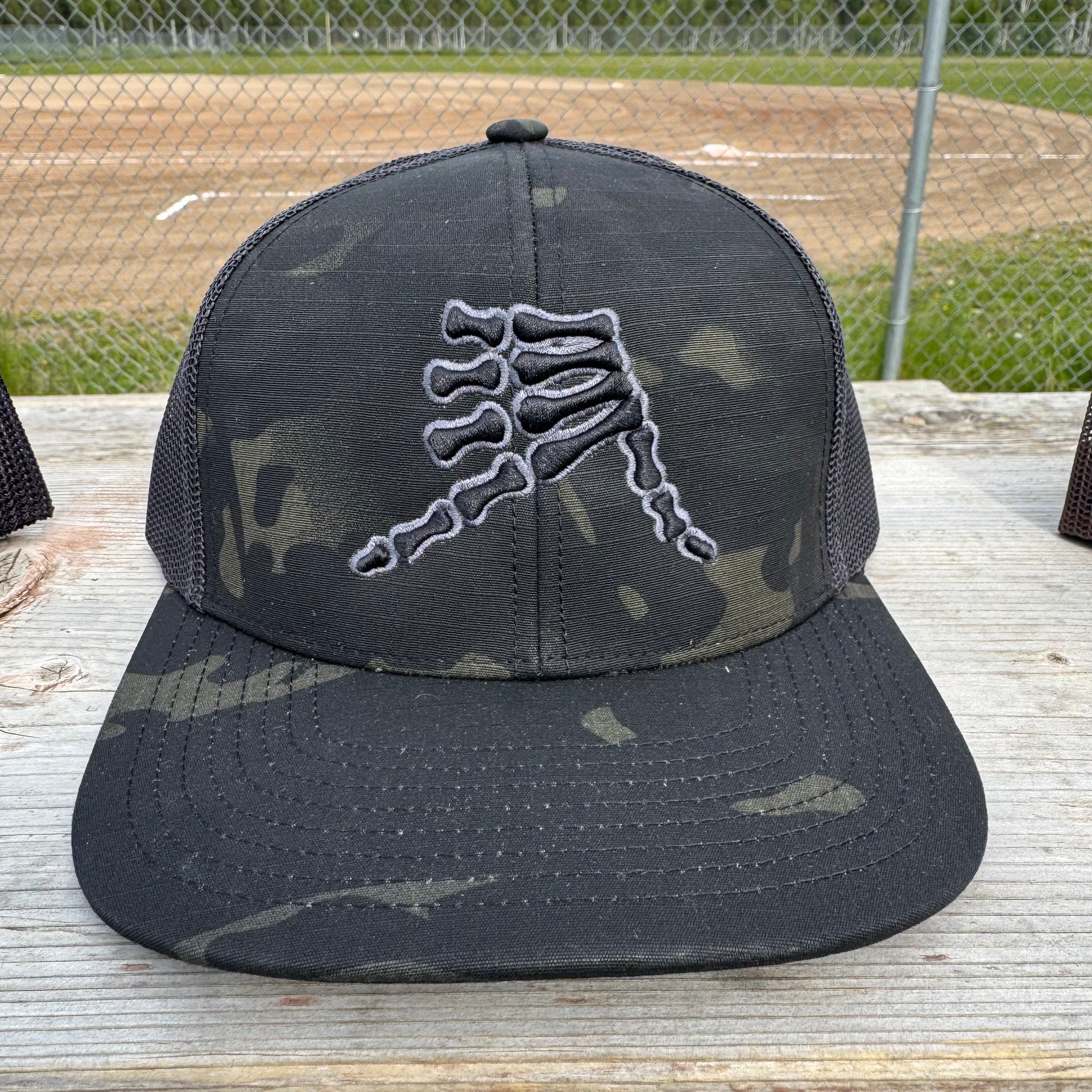 AkS Bones Snap-Back Trucker hat in Black Camo & Graphite