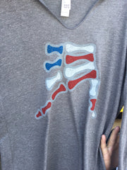 AkS Bones is our answer to explaining where you live in Alaska. Red, White, and Blue with Grey outline on a Grey Frost tri-blend long sleeve t-shirt hoodie