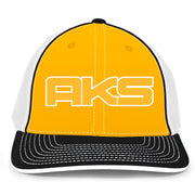 The new AkS Big Chi logo on a Gold & White & Black hat with Gold AkS and White outline, Gold AkSportswear on back. The logo may be slightly different in size and placement.
