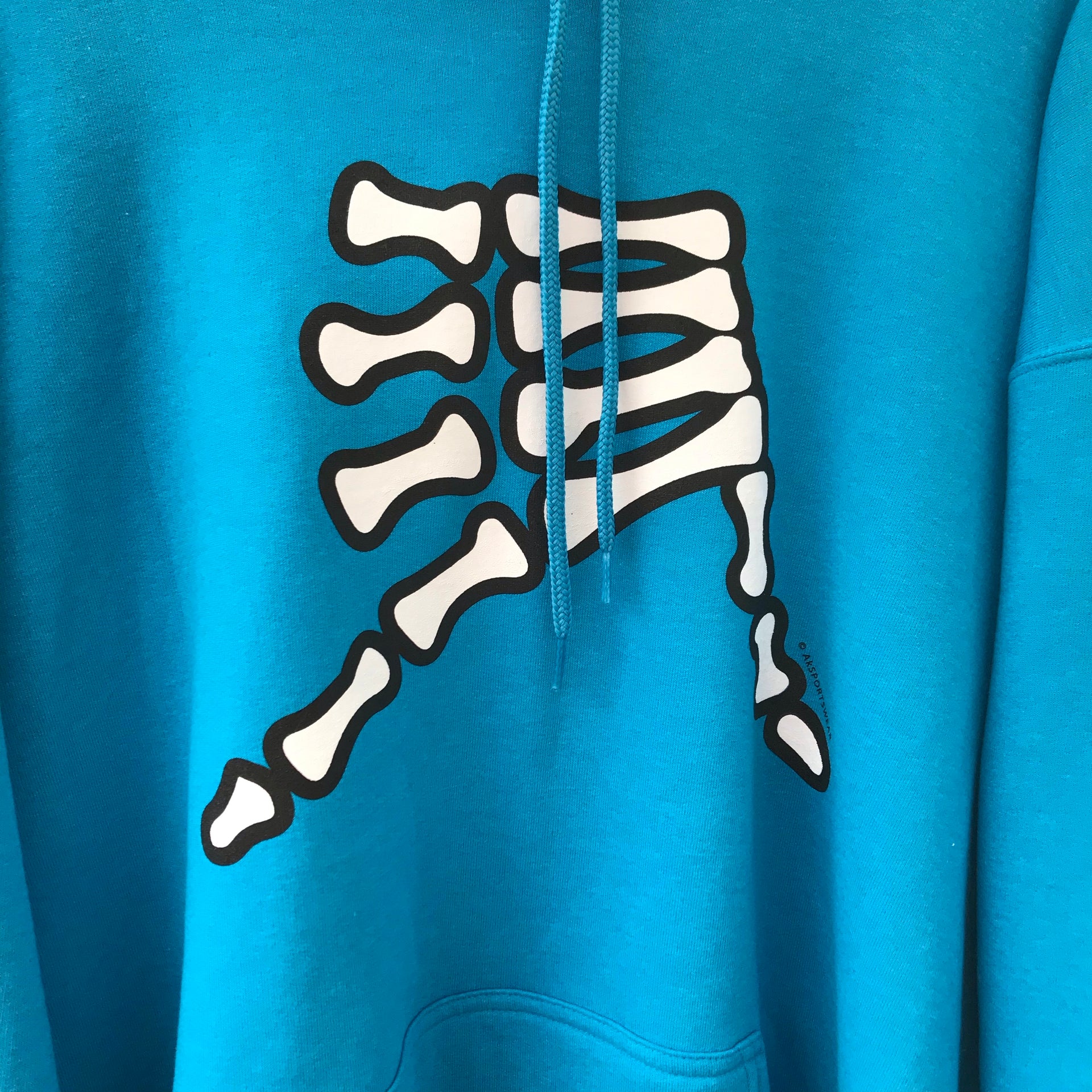 AkS Bones is our answer to explaining where you live in Alaska. White logo with Black outline on front of Neon Blue hoodie. AkS Shield logo on back lower right.